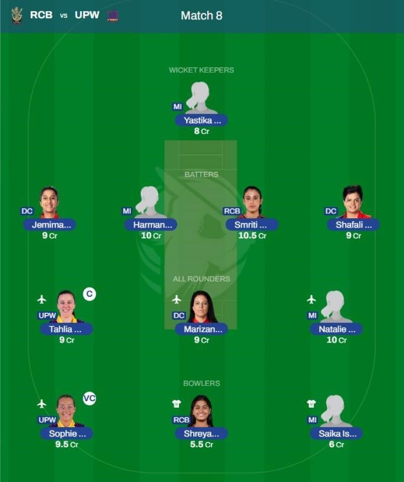 Players playing in Match 8: Sophie Ecclestone (BOWL) (UPW) (9.5 Credits), Shreyanka Patil (BOWL) (RCB) (5.5 Credits), Smriti Mandhana (BAT) (RCB) (10.5 Credits), and Tahlia McGrath (ALL) (UPW) (9 Credits).