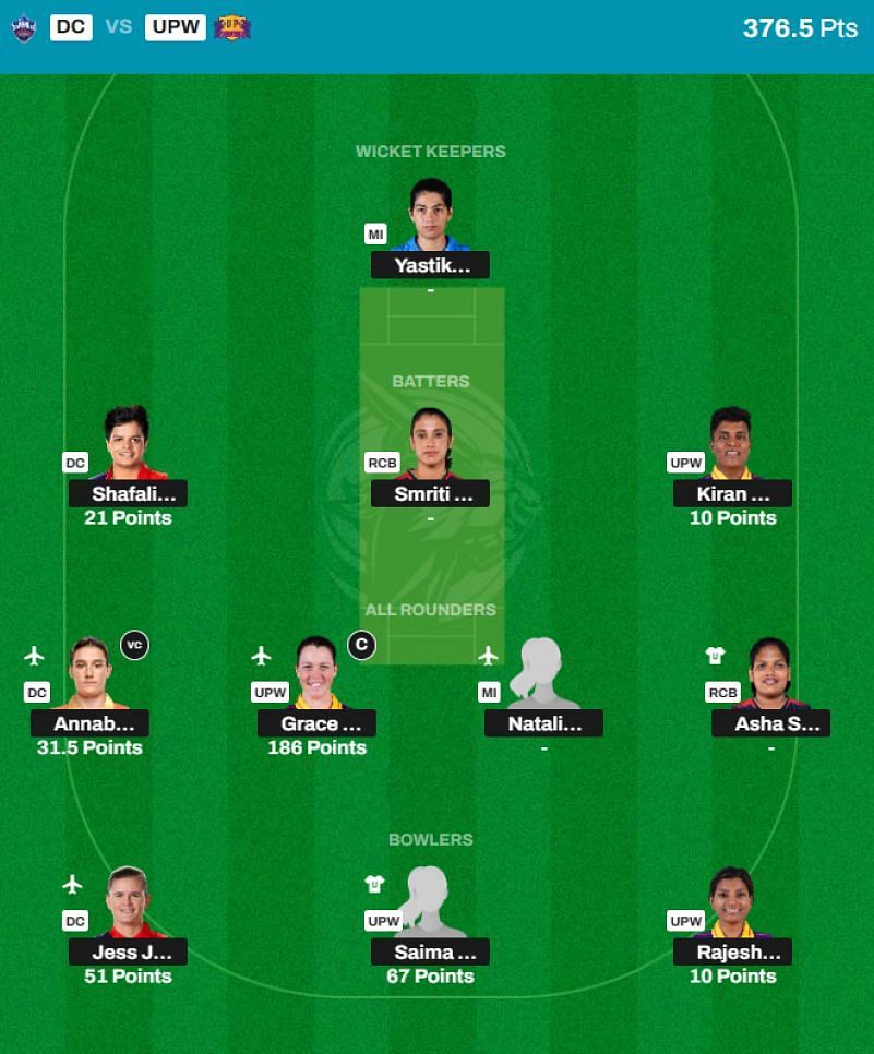 Players playing in Match 15: Jess Jonassen (DC) (9.5 Credits), Annabel Sutherland (ALL) (DC) (9 Credits), Saima Thakor (BOWL) (UPW) (5 Credits), Rajeshwari Gayakwad (BOWL) (UPW) (9 Credits), Kiran Navgire (BAT) (UPW) (7.5 Credits), Grace Harris (ALL) (UPW) (9 Credits), and Shafali Verma (DC) (10 Credits).