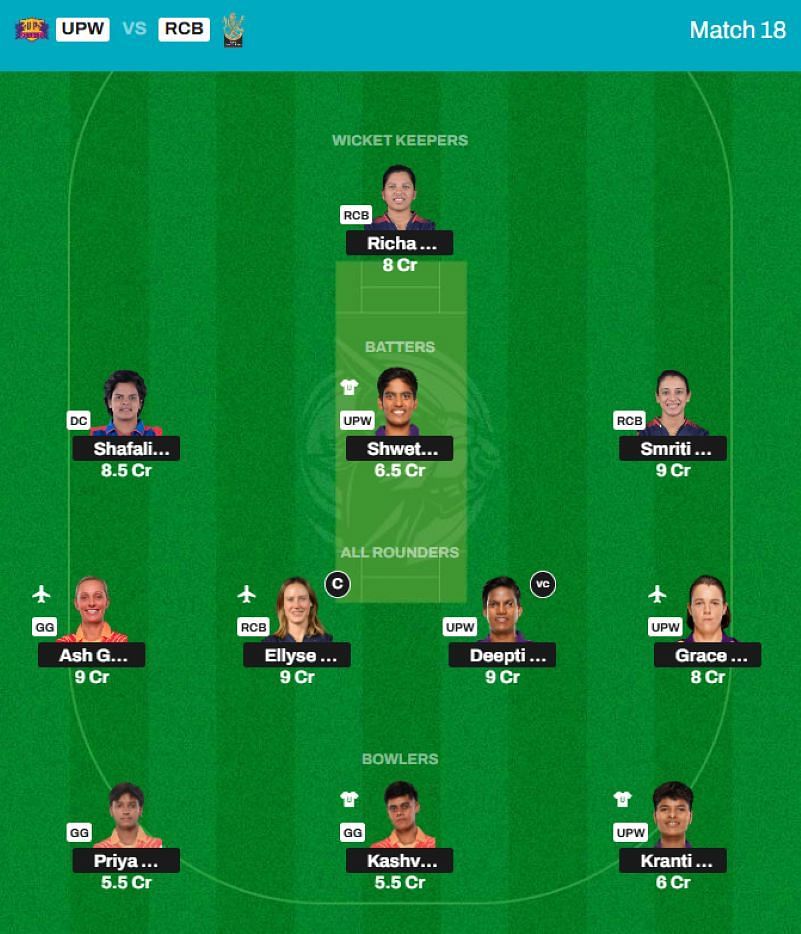 Players playing in Match 18: Grace Harris (ALL) (UPW), Deepti Sharma (ALL) (UPW), Kranti Goud (BOWL) (UPW), Richa Ghosh (WK) (RCB), Smriti Mandhana (BAT) (RCB), Ellyse Perry (ALL) (RCB), and Shweta Sehrawat (BAT) (UPW).