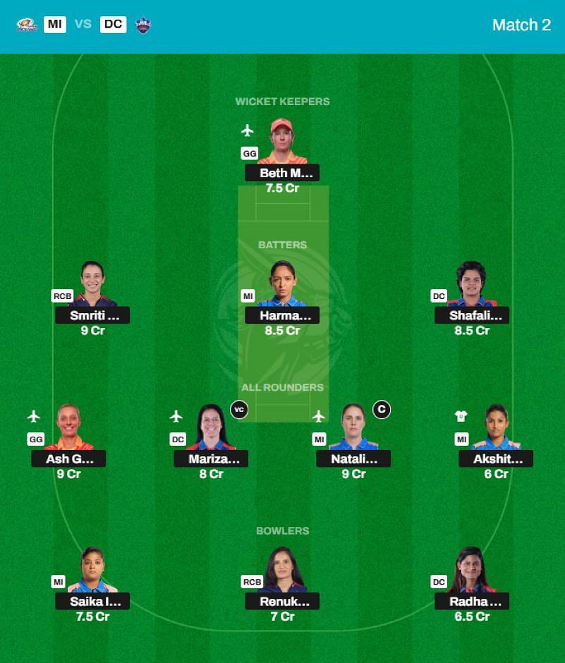 Players playing in Match 2: Harmanpreet Kaur (MI), Shafali Verma (DC), Radha Yadav (DC), Saika Ishaque (BOWL) (MI), Nat Sciver-Brunt (ALL) (MI), Marizanne Kapp (ALL) (DC), and Akshita Maheshwari (ALL) (MI).