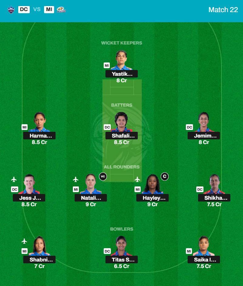 Players playing in Match 22: Jess Jonassen (ALL) (DC), Nat Sciver-Brunt (ALL) (MI), Hayley Matthews (ALL) (MI), Titas Sadhu (BOWL) (DC), Shabnim Ismail (BOWL) (MI), Jemimah Rodrigues (BAT) (DC), Shikha Pandey (ALL) (DC), Shafali Verma (BAT) (DC), Yastika Bhatia (WK) (MI), Harmanpreet Kaur (BAT) (MI) and Saika Ishaque (BOWL) (MI).