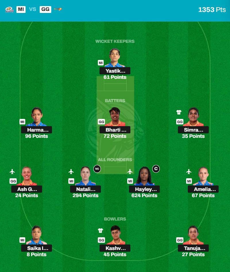 Players playing in Match 21: Tanuja Kanwar (BOWL) (GG), Nat Sciver-Brunt (ALL) (MI), Hayley Matthews (ALL) (MI), Ashleigh Gardner (ALL) (GG), Simran Shaikh (BAT) (GG), Kashvee Gautam (BOWL) (GG), Yastika Bhatia (WK) (MI), Bharti Fulmali (BAT) (GG), Saika Ishaque (BOWL) (MI), Harmanpreet Kaur (BAT) (MI), and Amelia Kerr (ALL) (MI).