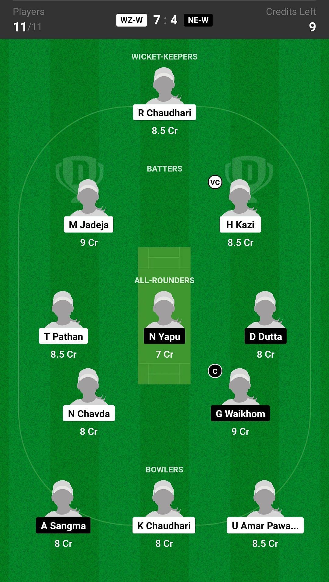 G Waikhom is one of the best picks in the North East Zone Women's squad as she will bat in the middle order and also complete her quota of overs. Since the pitch is decent, she can be a good captaincy pick for the grand leagues.