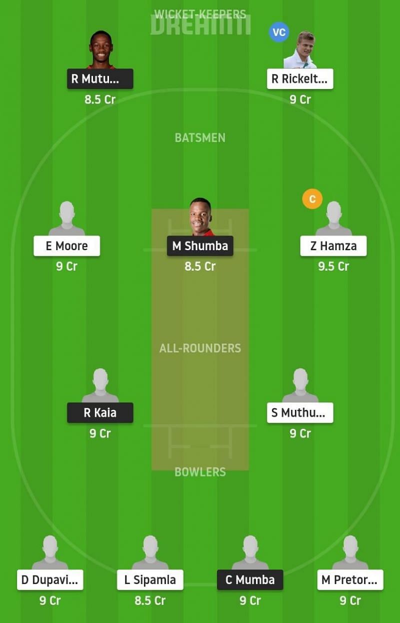 Fantasy Suggestion #1: R Rickelton, R Mutumbami, Z Hamza, E Moore, M Shumba, R Kala, S Muthusamy, D Dupavillon, L Sipamla, M Pretorius, C Mumba