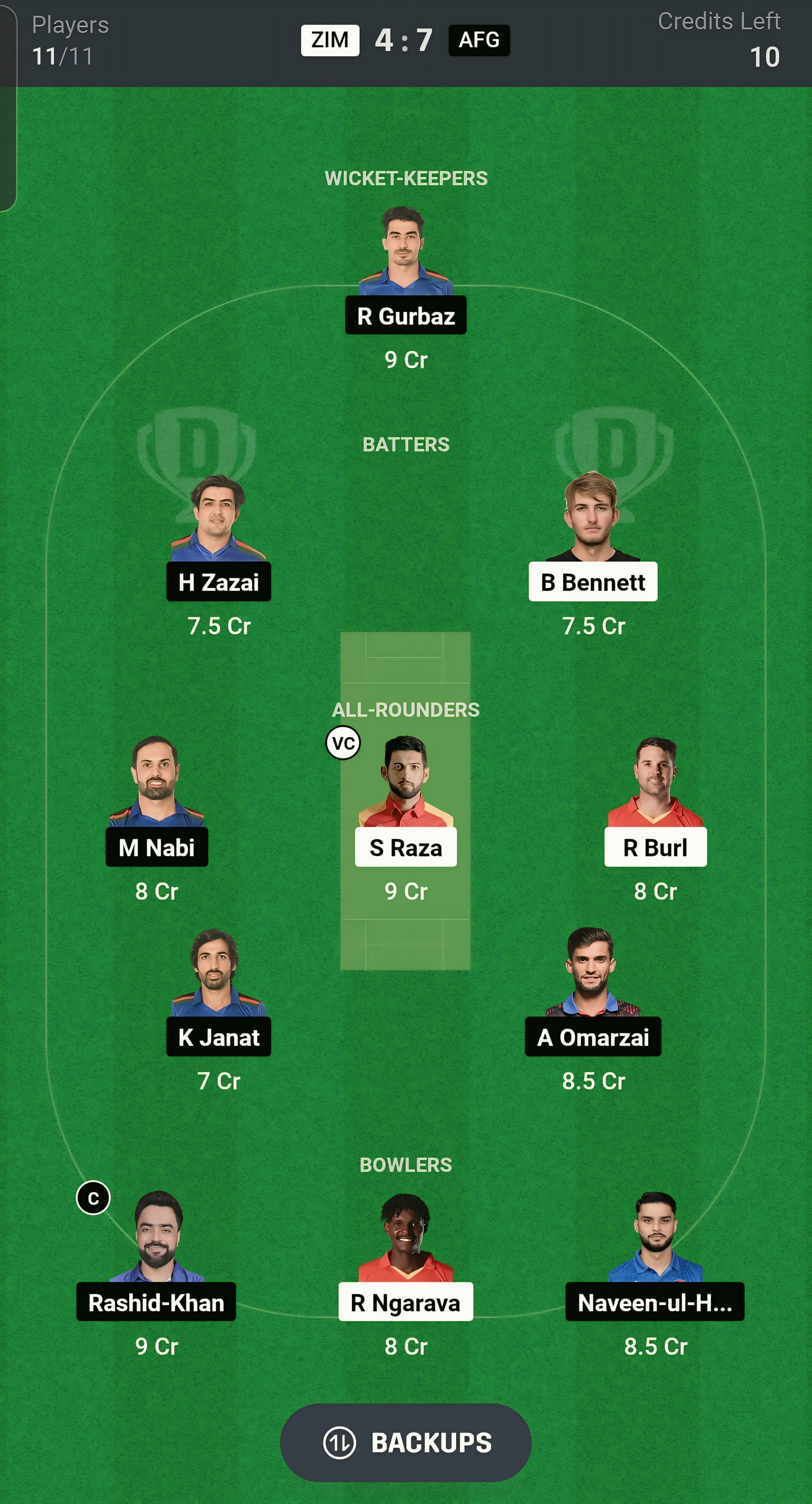 Azmatullah Omarzai and Sikandar Raza are the best all-rounder picks for the Dream11 team. Sikandar Raza has already smashed 2306 runs and taken 77 wickets in just 100 T20I matches. Mohammad Nabi is another good all-rounder for today's match.
