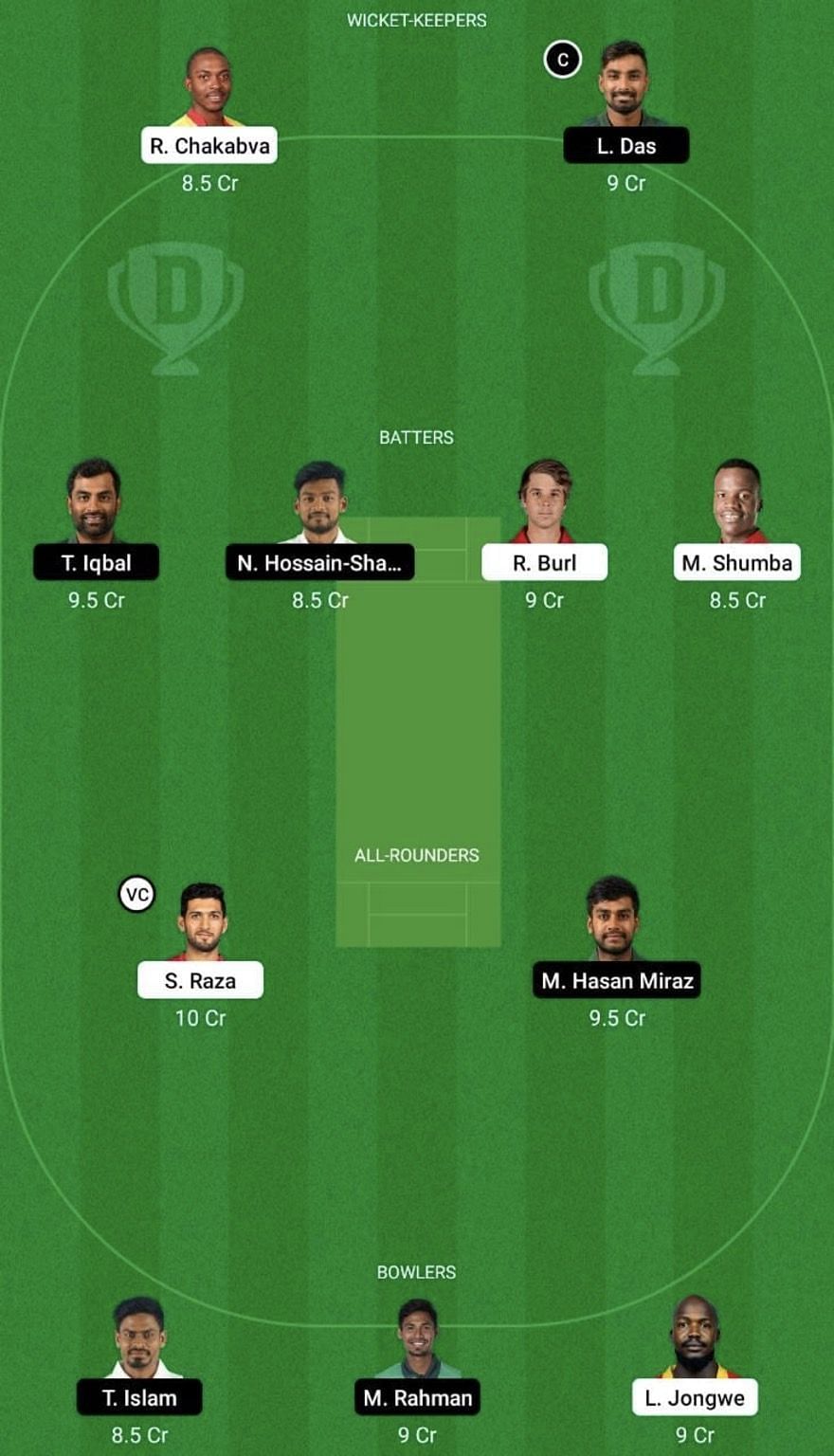 Fantasy Suggestion #1: R Chakabva, L Das, T Iqbal, N Hossain Shanto, R Burl, M Shumba, S Raza, M Hasan Miraz, T Islam, M Rahman and L Jongwe.