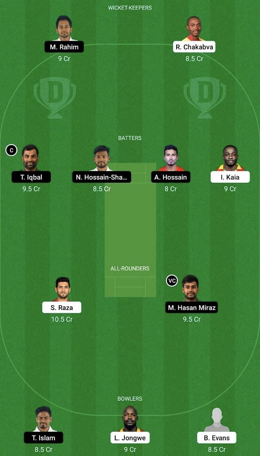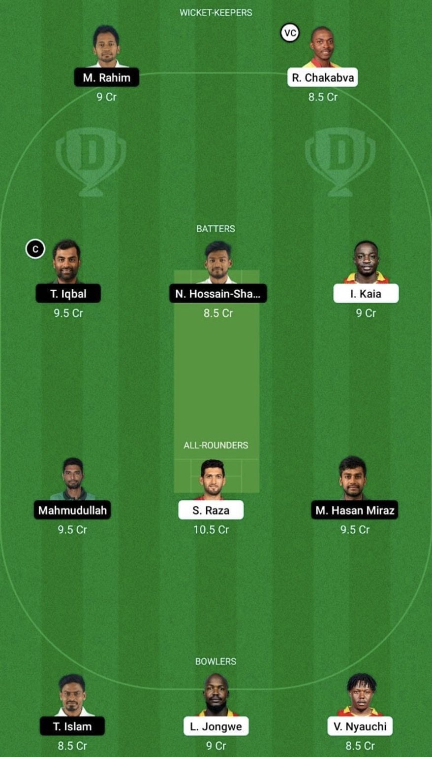 Fantasy Suggestion #2: Mushfiqur Rahim, Regis Chakabva, Tamim Iqbal, Najmul Hossain Shanto, Innocent Kaia, Afif Hossain, Sikandar Raza, Mehidy Hasan, Taijul Islam, Luke Jongwe and Brad Evans.