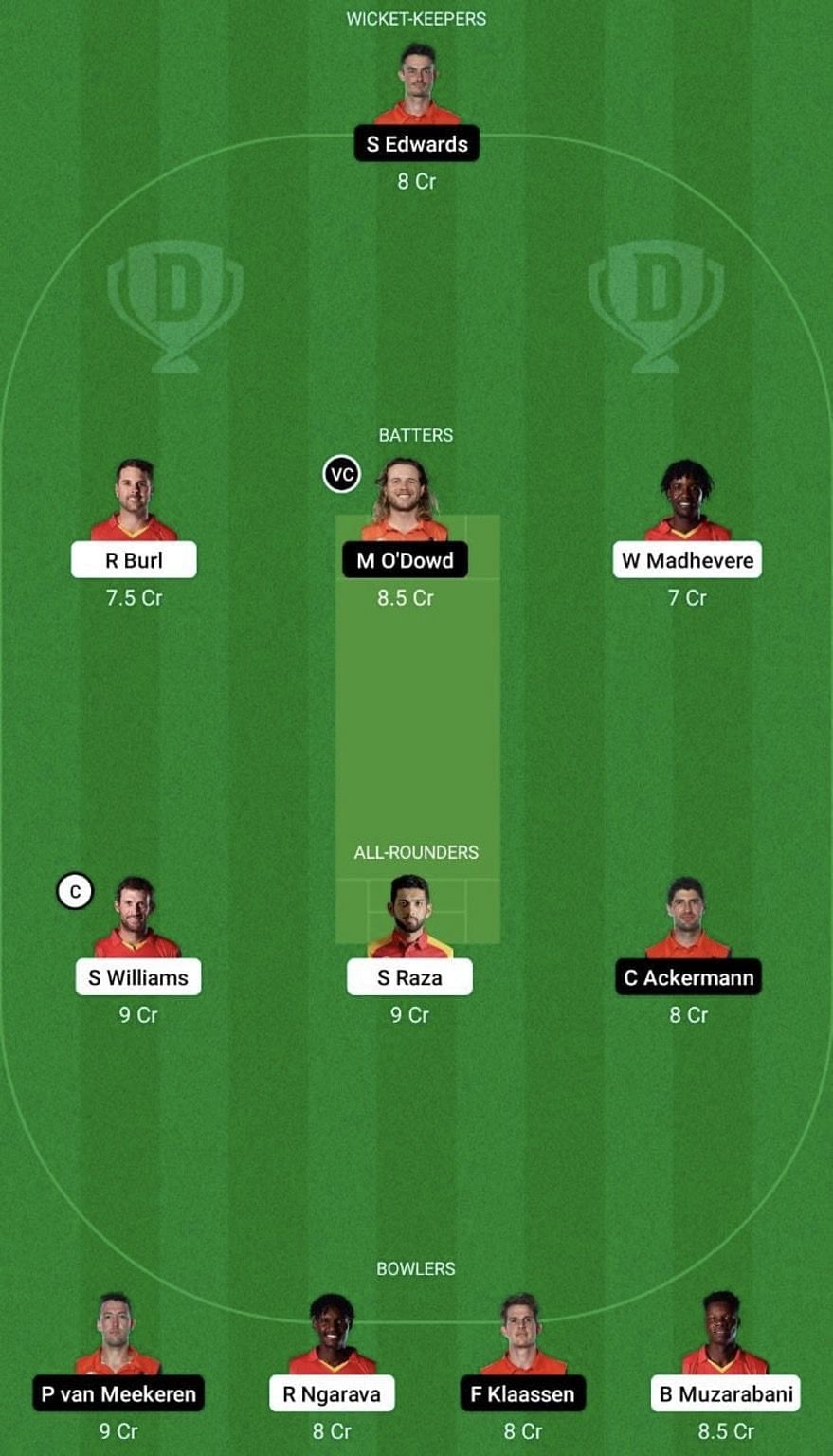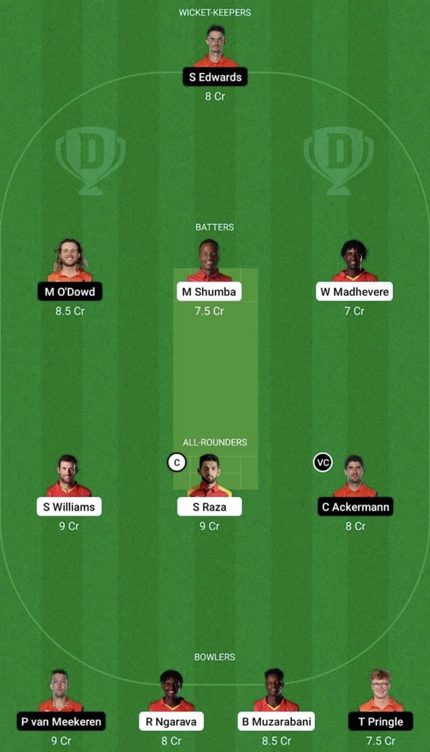 Regis Chakabva (wk), Wesley Madhevere, Craig Ervine (c), Sean Williams, Sikandar Raza, Milton Shumba, Ryan Burl, Tendai Chatara, Richard Ngarava, Brad Evans and Blessing Muzarabani.