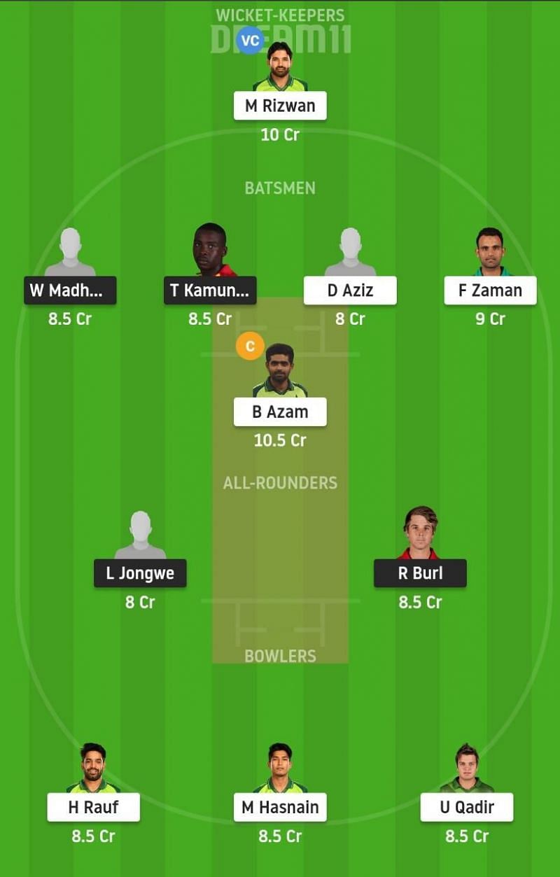Fantasy Suggestion #1: Mohammad Rizwann, Wesley Madhevere, Danish Aziz, Babar Azam, Tinashe Kamunhukamwe, Fakhar Zaman, Luke Jongwe, Ryan Burl, Mohammad Hasnain, Usman Qadir, Haris Rauf