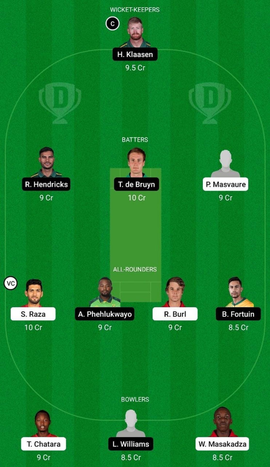 Fantasy Suggestion #1: Heinrich Klaasen, Milton Shumba, Prince Masvaure, Reeza Hendricks, Theunis de Bruyn, Andile Phelukwayo, Ryan Burl, Sikandar Raza, Lizaad Williams, Tendai Chatara, Wellington Masakadza.