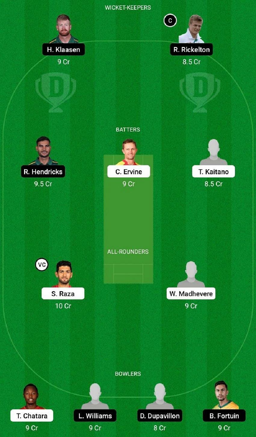 Fantasy Suggestion #1: H Klaasen, R Rickelton, R Hendricks, C Ervine, T Kaitano, S Raza, W Madhevere, T Chatara, L Williams, D Dupavillon and B Fortuin.