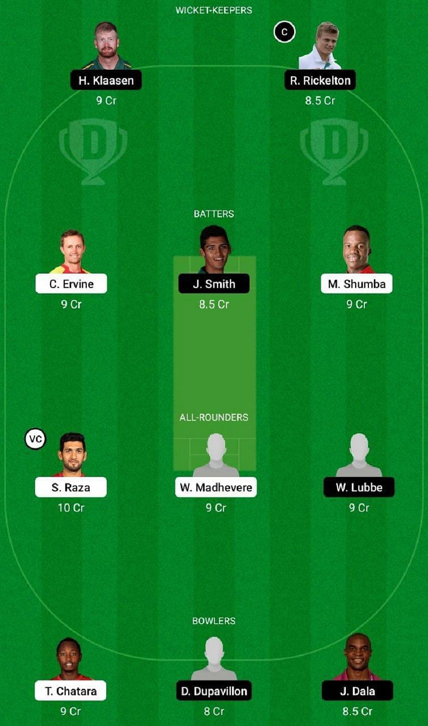 Fantasy Suggestion #1: H Klaasen, R Rickelton, C Ervine, J Smith, M Shumba, S Raza, W Madhevere, W Lubbe, T Chatara, D Dupavillon and J Dala.