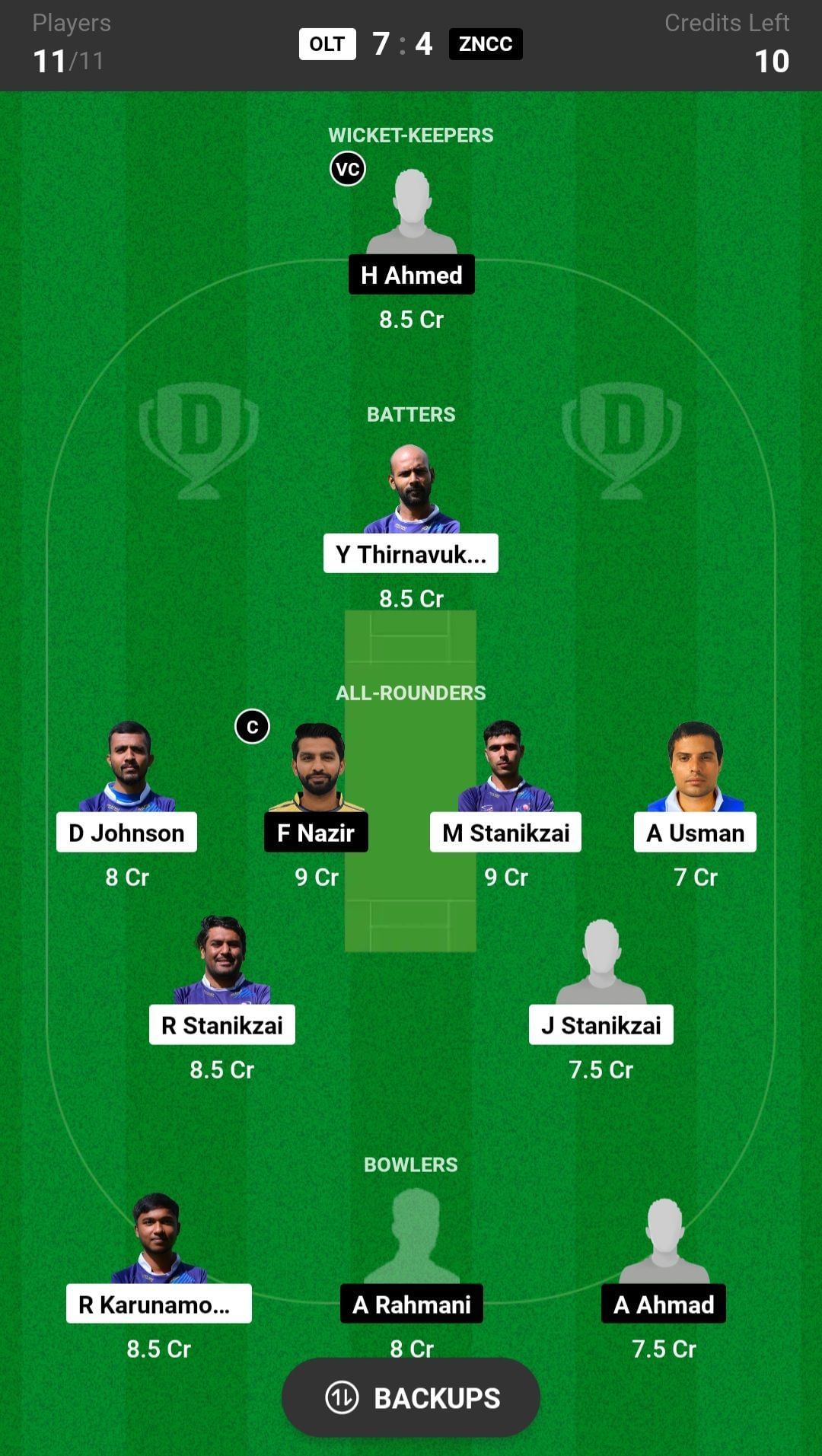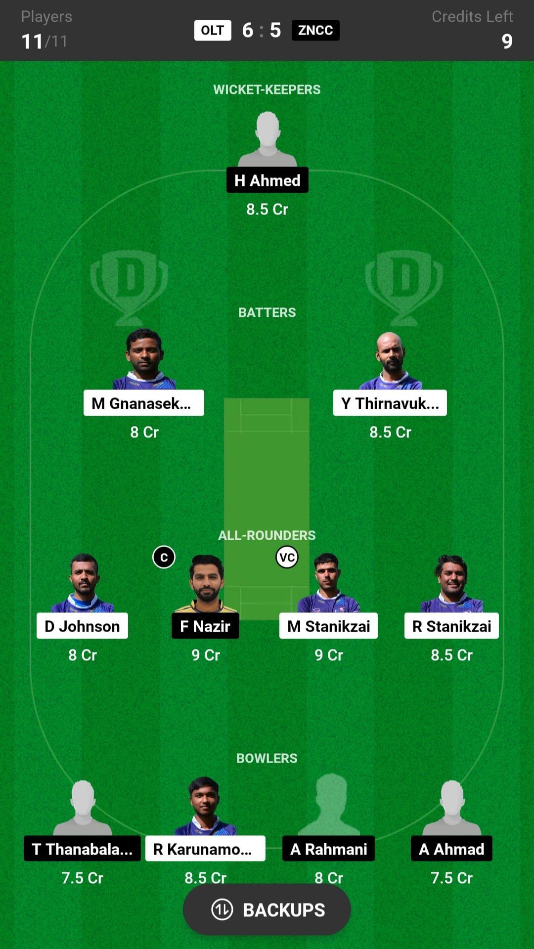 F Nazir will bat in the top order and also complete his quota of overs, making him the safest pick for the captaincy. He is expected to play a crucial role in today's nail-biting match. He has earned 1238 points in the last 12 matches.