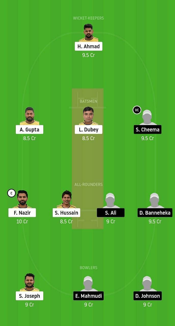 Fantasy Suggestion #1: H Ahmad, S Cheema, A Gupta, L Dubey, F Nazir, S Hussain, S Ali, D Manneheka, S Joseph, E Mahmudi and D Johnson
