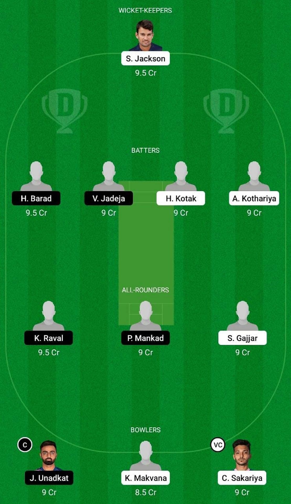 Fantasy Suggestion #2: S Jackson, A Kothariya, V Jadeja, H Kotak, H Barad, S Gajjar, K Raval, P Mankad, K Makvana, C Sakariya, J Unadkat.