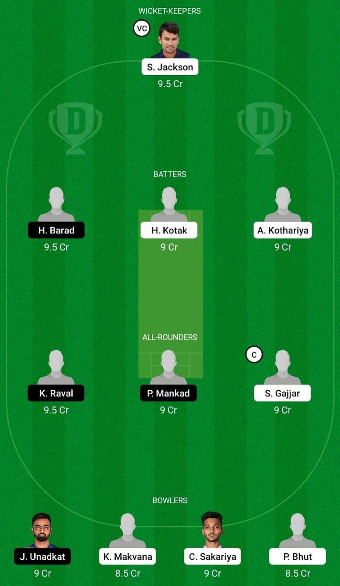 Fantasy Suggestion #1: S Jackson, A Kothariya, H Kotak, H Barad, S Gajjar, K Raval, P Mankad, P Bhut, K Makvana, C Sakariya, J Unadkat.