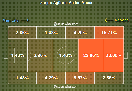 That attempted effort from Aguero was his first shot of the game, but he went on to have a total of nine attempts—three times as many as anybody else during the match. Norwich’s rather desperate defending at times contributed to the chances he had, but it was also displayed in that five of his efforts were blocked at very close range.