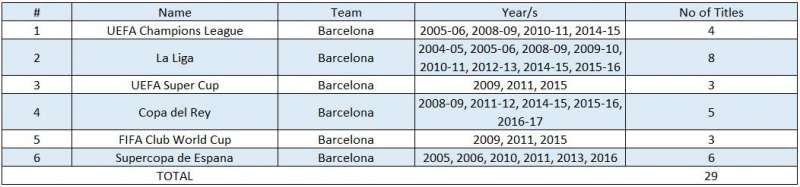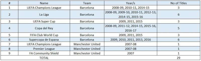 [Note: Lionel Messi has one more trophy than Andres Iniesta due to the Argentine’s participation in the 2009 Supercopa de Espana, which the Spaniard missed.]