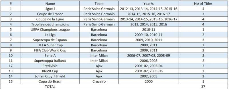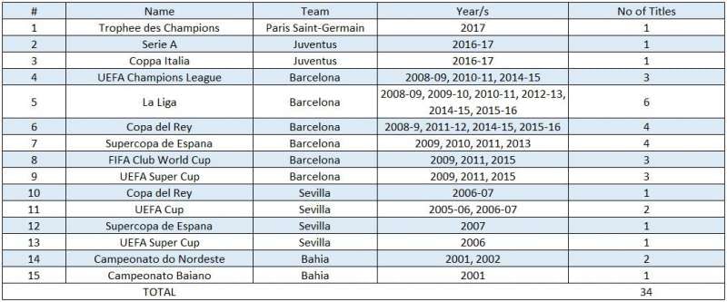 The Brazilian has won an incredible 37 trophies during his 17-year-long top-flight career which started with Cruzeiro in 2000.