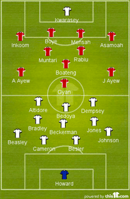 Ghana (4-2-3-1): Adam Kwarasey; Kwadwo Asamoah, John Boye, Jonathan Mensah, Samuel Inkoom; Mohammed Rabiu, Sulley Muntari; Kevin-Prince Boateng, Andre Ayew, Jordan Ayew; Asamoah Gyan