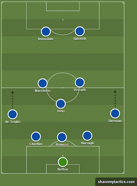 Prandelli can lineup with a 3-4-2-1 or 3-4-1-2 here too. Both formations will see Pirlo being alongside Verratti or Motta in a midfield two with Marchisio in a more advanced role. Verratti’s poor defensive ability will see him being dropped if this is the case. Incase of a 3-4-1-2, Immobile/Cassano will be dropped for Candreva or Cerci who will play in a role similar to what Candreva played against England, laterally moving right. Due to Candreva’s success, he will most likely play in that role.