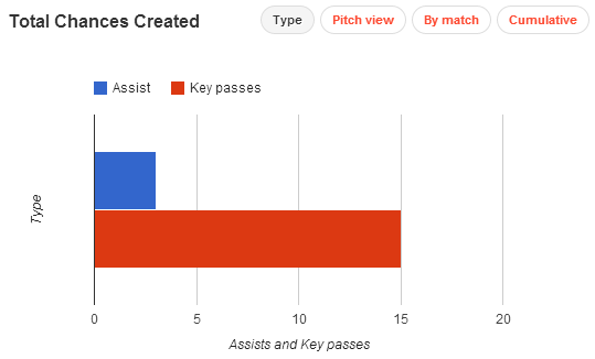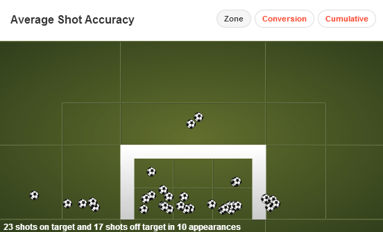 A shot accuracy of 58% is very good, especially considering the high amount of shots he has taken. But what’s particularly impressive is the general placement of his efforts–low and into the corners, which is most ideal. As far as transferring his excellent goal record to a more difficult league is concerned, good placement like that gives him a good chance of doing so.
