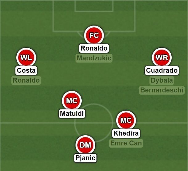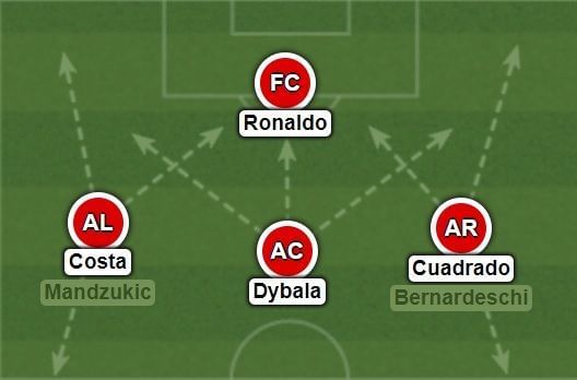 This is the formation Allegri has favored over the past couple of years with Juan Cuadrado and Douglas Cost/Mario Mandzukic on the wings, Paulo Dybala sitting behind Higuain.