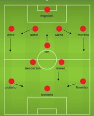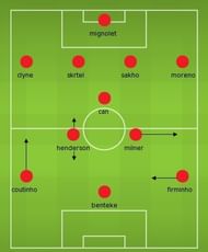 Rodgers' attacking scenarios have always been amplified by his wingbacks. Phillipe Coutinho and Roberto Firminho can drift towards the centre with Nathanial Clyne and Alberto Moreno taking their respective positions on the wings. James Milner joins up front as support to complement the mobility and fluidity of Coutinho and Firminho. Martin Skrtel and Mamadou Sakho drifts towards the spaces vacated by Clyne and Moreno with Can and Henderson holding the centre; Can performing as an auxiliary centre back.
