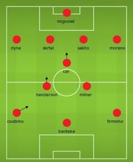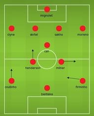Hence, from an attacking point of view Liverpool have three up front: Christian Benteke, Firminho and Coutinho; two on the wings: Clyne and Moreno; one behind the forwards: Milner; one holding the middle: Hendo one centre back: Can and finally, two full-backs: Skrtel and Sakho.