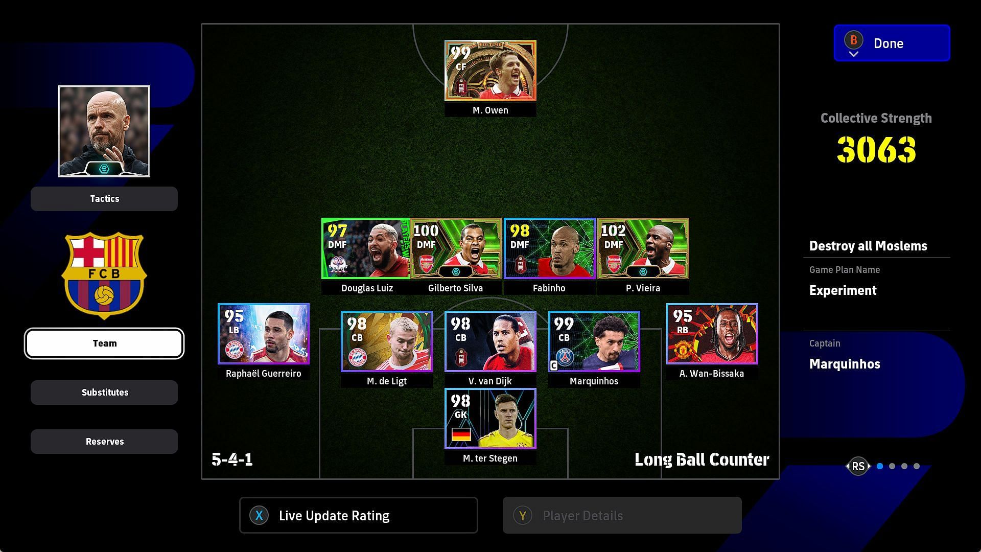 In defence, it's always better to have a ‘Build Up’ centre-back paired with two ‘Destroyer’ CBs. I have chosen Marquinhos as my build-up CB alongside the colossus Virgil van Dijk and his apprentice Mathijs de Ligt.