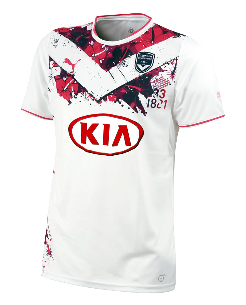 Having one of the best jerseys in the game is the French team Bordeux. Competing with big money teams like PSG and AS Monaco in the Ligue 1, Bordeux have held their own and managed to impress football fans with their football. Plus, dressed in their unique away kit, they are truly a delight to watch. Designed by Puma, the jersey is mostly white, except for a haphazard splash of red, black, purple and pink along the top end of the jersey. The colors are, however split by a white V design at the chest. The shorts too are wide, except for the same coloration at the edge of one side of the shorts and the stockings are white as well.