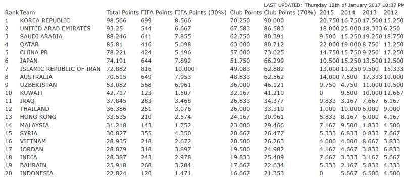 So back to the matter at hand, AFC MA Ranking (MA- Member Association) are how AFC decides if a club from a particular country goes into the AFC Champions League (Group stages or one of the preliminary stages) or the AFC Cup. The Rankings are calculated based on the performance of a country (the clubs) in AFC Competition in the last four years and the country’s FIFA Ranking (70-30 weightage).