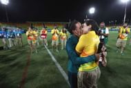 18) Rugby player Isadora Cerullo of Brazil (left) accepts girlfriend Marjorie Enya’s marriage proposal after the Sevens’ Gold medal match