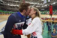 32) Women’s Omnium champion Laura Trott congratulates fiance & triple gold-medallist Jason Kenny on winning the Men’s Keirin finals