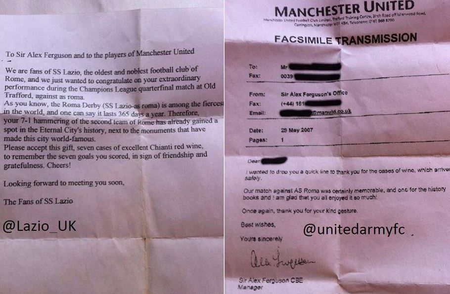 Here is a letter from Lazio fans to Sir Alex Ferguson after Manchester United defeated Roma 7-1 in Champions League quarter finals at Old Trafford, 2007. They also gifted seven cases of Chianti red wine to the former United boss for defeating their rivals.