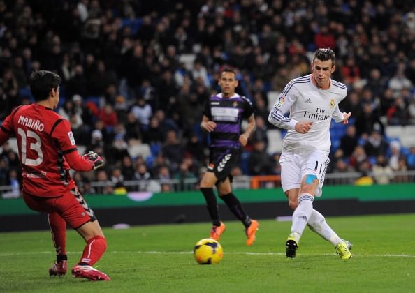 Gareth Bale of Real Madrid CF scores Real’s 4th goal and his hat-trick past Diego Marino of Real Valladolic CF.