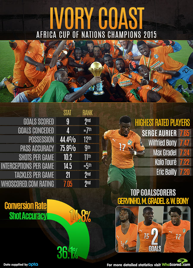 Since Zambia’s success in 2012 – the beginning of the Hervé Renard revolution – the influence of individuals has waned, and there has been a general recognition that what wins tournaments is the strength and discipline of the team unit. That perhaps explains the relatively low number of goals – just 2.13 per game, although that figure wasn’t helped by the poor pitches in Mongomo and Ebebiyin, which, laid only a fortnight before the tournament began, struggled to live up to the strain.Even before Barry made himself the hero of the final, this had been a good tournament for goalkeepers; the days when African goalkeepers were the subject of mockery is long gone. The best goalkeeper on the continent, Vincent Enyeama, wasn’t even there after Nigeria failed to qualify, but Sylvain Gbohouo, Razak Braimah and the veteran Robert Kidiaba, still doing his bottom-bouncing celebration, all performed well. The pick of the keepers, though, was Felipe Ovono, the 21-year-old Equatorial Guinea keeper who surely won’t be at Deportivo Mongomo much longer after making it into WhoScored's team of the tournament with a rating of 7.19.