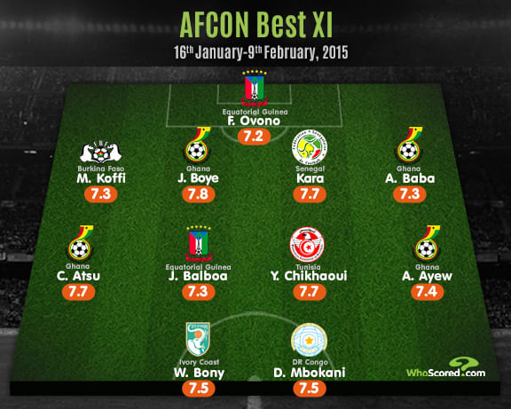 It was a good tournament too for tall, powerful central defenders. Ivory Coast, as well as Kolo Touré who made a colossal 36 clearances at the tournament, have a fine young pairing in Eric Bailly and Wilfried Kanon, who look likely to form the heart of the side for years to come. Both, significantly, showed great calm in converting their penalties in the shoot-out in the final. Kara Mbodj (7.72) of Senegal, who scored one towering goal against South Africa and John Boye (7.77) of Ghana came out on top in the Whoscored rankings to take the central defensive positions in the team of the tournament.