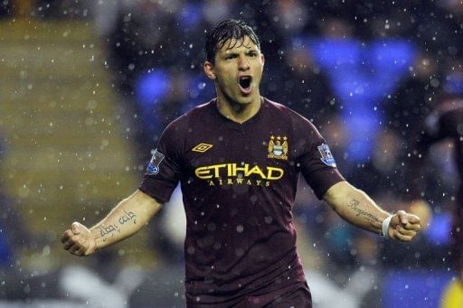Manchester City‘s Argentine striker Sergio Aguero celebrates scoring the opening goal during the English Premier League football match between Manchester City and Reading at The Madejski Stadium in Reading, England, on May 14, 2013. City won 2-0.
