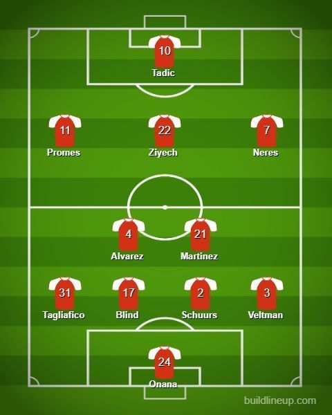 Ajax (4-2-3-1): Onana; Veltman, Schuurs, Blind, Tagliafico; Martinez, Alvarez; Ziyech, Promes, Neres; Tadic