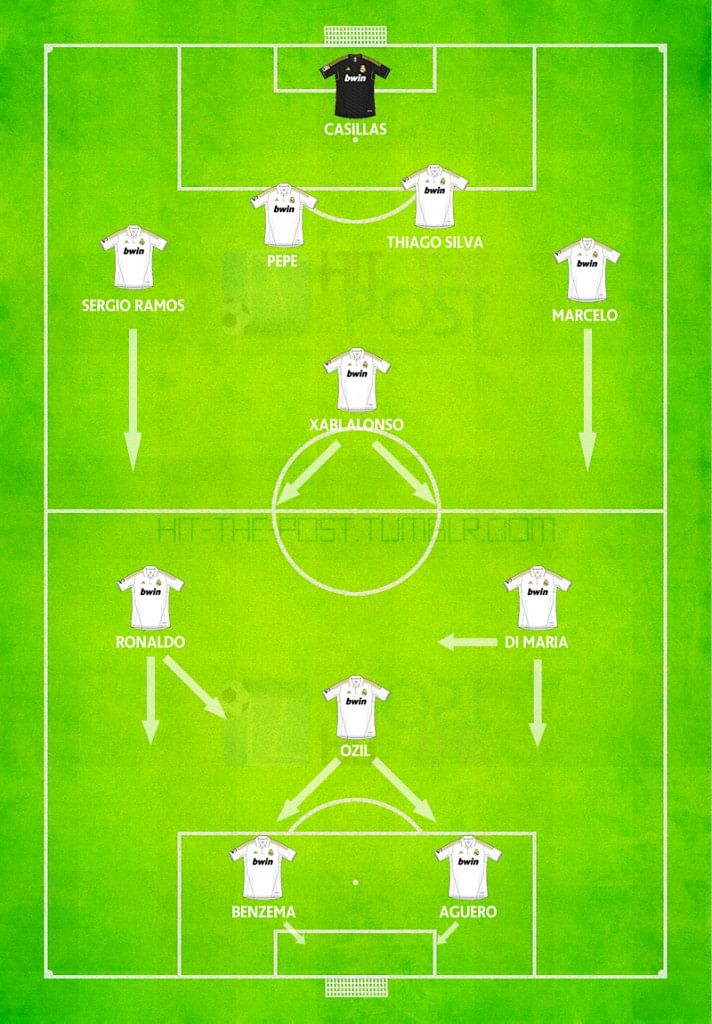 Cristiano will play on the right wing with Di-Maria on the left. Both of them can pepper the strikers with delicious crosses and also stifle the opponent by making incisive, razor-sharp runs in the penalty region. They are both lethal finishers as well. Whilst the Portuguese and the Argentine are operating at the wings, Ozil will orchestrate the midfield area as an attacking midfielder, frequently teaming up with Xabi Alonso and making run-ins and provide deadly through-balls to feed the two forwards. While Benzema retains his position as the first striker, Madrid have been in the market for another striker for a long time (even though they have El Pipito). While the deal for Santos starlet Neymar has collapsed, they have long been admirers of Kun Aguero, currently playing for Manchester City. A deal for the Argentine is likely to happen this summer. Maradona has even advised his son-in-law publicly to make a move to Santiago Bernabeu, in order to boost his career.