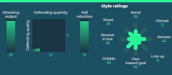 As the above image indicates, Grealish retains the ball very well. He is also a heavy contributor to Aston Villa's attacks as shown by his attacking output. The Englishman is not one to dribble excessively but rather tries to bring his teammates into the game.