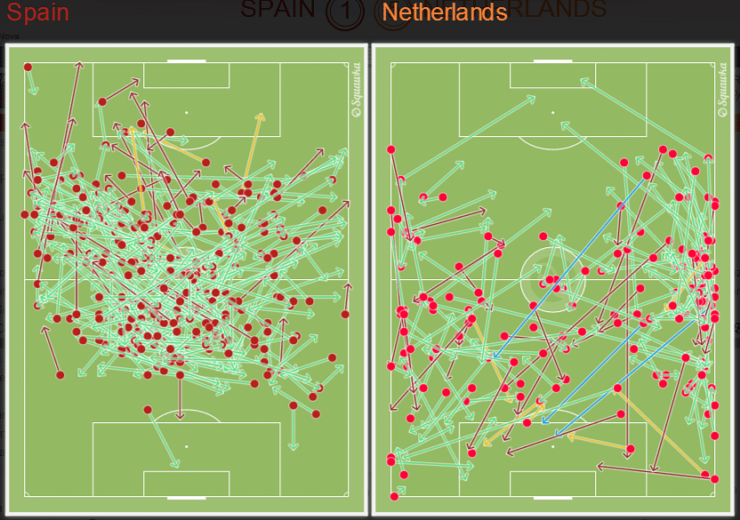 The defenders play with too high a line, leaving gaping holes in defence and when their comparatively weak midfielders got dispossessed, the defence was left scrambling to run back, often conceding goals on quick counters. Another reason for the same is the lack of width on the pitch. With Jesus Navas excluded, Pedro was the only conventional winger for del Bosque to deploy, and as a result, the full backs are often posted permanently as wingers. This forces the centre backs to a much wider position, leaving huge spaces in the heart of Spanish defence (something which quick players exploit to the fullest) .