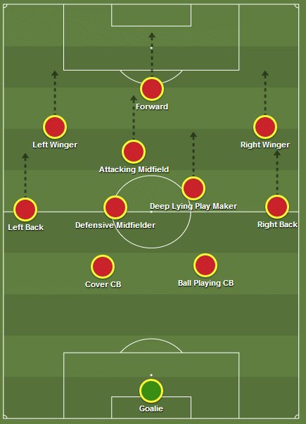 First of all, we will have a look into the formation of a high-pressing system. The formation here is a 4-2-3-1 (the most-used formation nowadays) but it can be easily reverted to a 4-3-3 with the attacking midfielder dropping deeper. The formation requires all 11 players to press, and only at top sides like Real Madrid can a compromise of one player’s lack of defensive work-rate be reached.