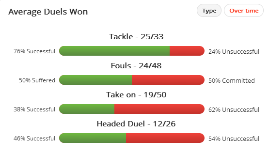 The Naples native has won 25 of 32 attempted tackles this term (76%) whilst completing 19 take-ons in a solid display of the versatility he offers out wide.