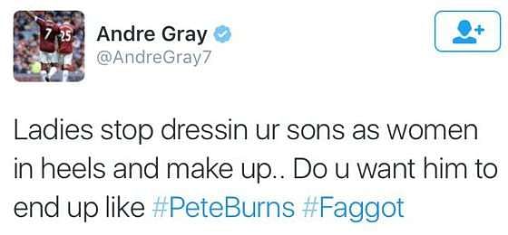 In another tweet, he seems to be blaming mothers for their children being gay. Gray posted: “Ladies stop dressin ur sons as women in heels and make up. Do you want him to end up like #PeteBurns #F****.”