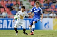 Marco van Ginkel of Chelsea FC with Chanathip Songkrasin of Singha All-Star during the international friendly match between Chelsea FC and the Singha Thailand All-Star XI on July 17, 2013 in Bangkok, Thailand. (Photo by Thananuwat Srirasant/Getty Images)