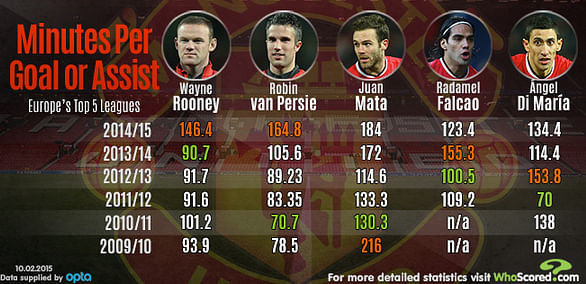 The bare stats alone are bad. In terms of minutes between goals and assists, all of their premium creators are having hugely unproductive seasons by their standards. Rooney, Van Persie and Mata are enduring their worst in five years.
