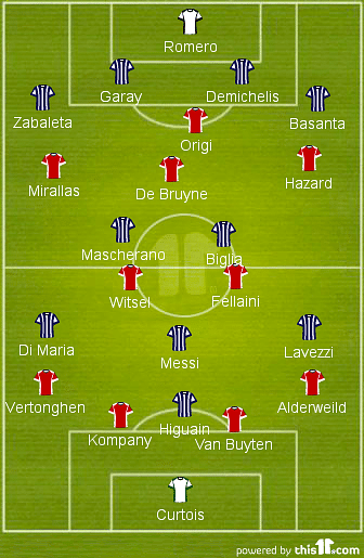 Argentina made a few changes to their line up from the previous game. Rojo, Gago and Fernandez made way for Basanta, Biglia and Demechelis. This meant that it was Basanta and Zabaleta as the full backs and Garay and Demechelis lined up in central defence. Biglia and Mascherano were the central midfielders and Lavezzi and Di Maria were stationed on the flanks while Messi partnered Higuain up front. The central midfielders would be expected to just provide cover to the defense as neither is particulary adept going forward.