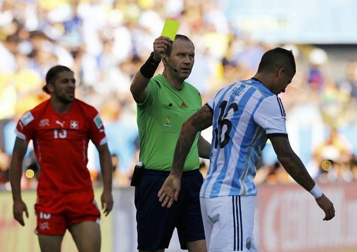 The 24-year-old was booked in the 90th minute for bringing down Switzerland's Ricardo Rodriguez to halt a counter-attack, incurring the suspension as he already had a yellow card in Argentina's Group G match against Bosnia, reports Xinhua.